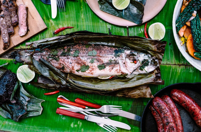 This beautiful make-ahead recipe is perfect for backyard parties. You can prepare and tie up these bundles in the morning and store them in the refrigerator until cook time while you tend to other party preparations. Not only do the banana leaves add flavor, but they also make for a stunning presentation. If you can’t source banana leaves, aluminum foil can be substituted—but it won’t add that intoxicating banana-leaf aroma.