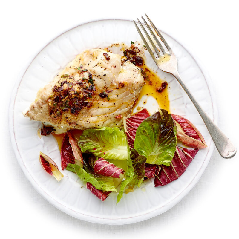 Big, meaty calamari steaks are sweet and mildly flavored, so they benefit from the bold, salty flavors of olives, anchovies, and capers. You’ll find the steaks—we like those from large Humboldt squid—in the frozen seafood section of your grocery store. This seafood dish packs in a salty, citrusy flavor that is exquisitely complemented by hearty white beans and fresh herbs on top.