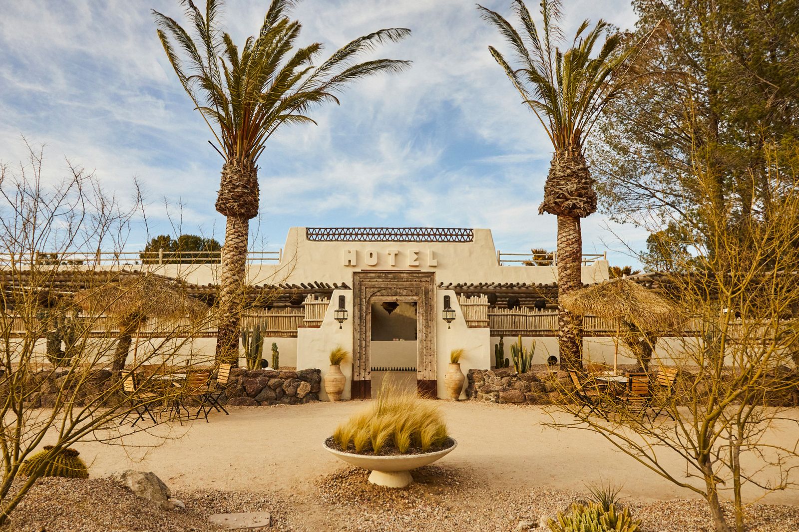 The sun is setting in San Diego’s Sonoran Desert. A dusty fuchsia hue, the color of bougainvilleas, stretches across the sky. The air smells of spices and sulfur. Less than half a mile to the south, the U.S.-Mexico border wall looms with its tall, rusted slats. A couple emerges from a vintage Argosy trailer—its shell painted “Hotel Check-in”—with sand-colored ceramic mugs in hand. Nearby, the freshly renovated Jacumba Hot Springs Hotel blends in with the desert landscape, its adobe-inspired walls and other hallmarks of Pueblo Revival-and Southwestern-style architecture, like exposed vigas, flanked by palms and a xeriscaped courtyard.
