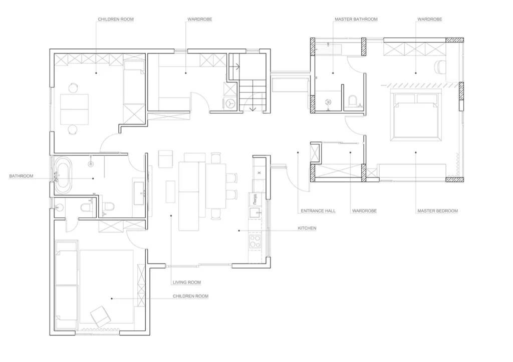 The floor plan of the space shows a practical yet segmented layout: a central open-plan living and dining area anchored by the kitchen, a private master suite with its own wardrobe and bath, and two children’s rooms connected by a shared bathroom. The renovation focused on enhancing flow, improving natural light, and unifying these zones.