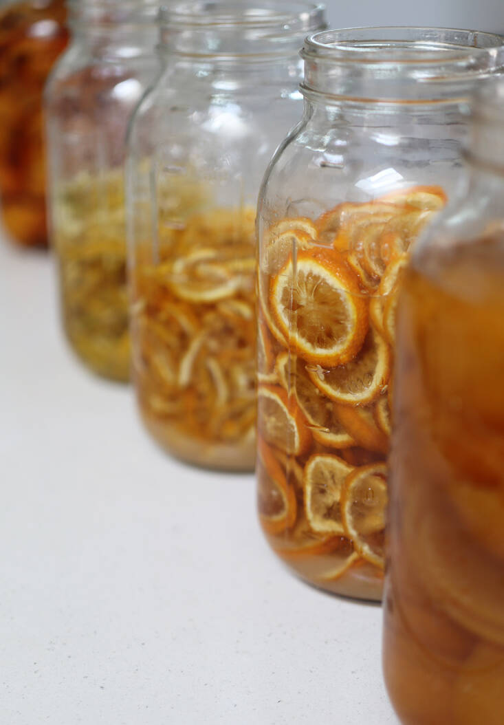 Above: The jar is shaken to distribute the sugar throughout the yuzu slices.